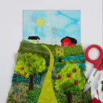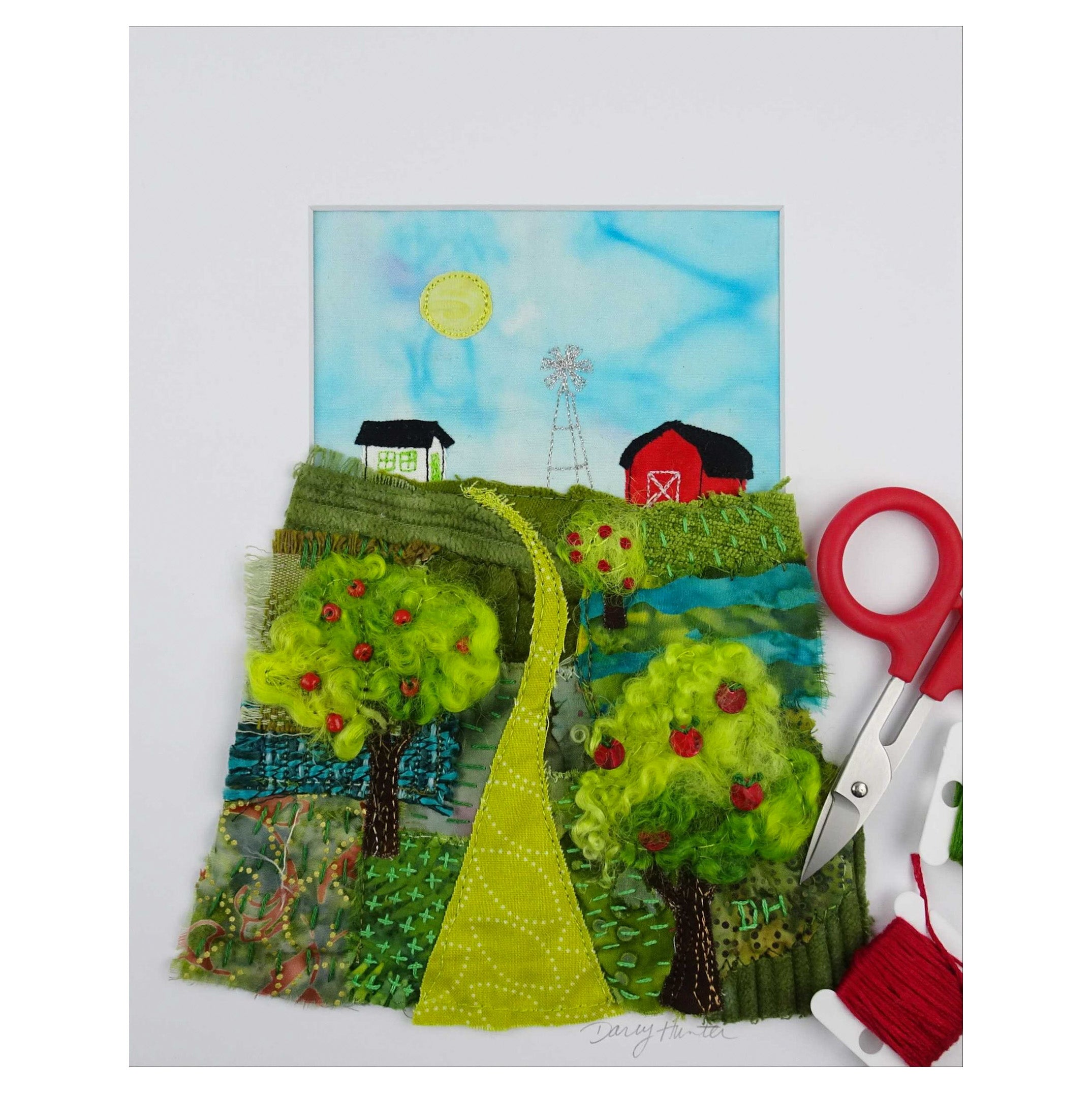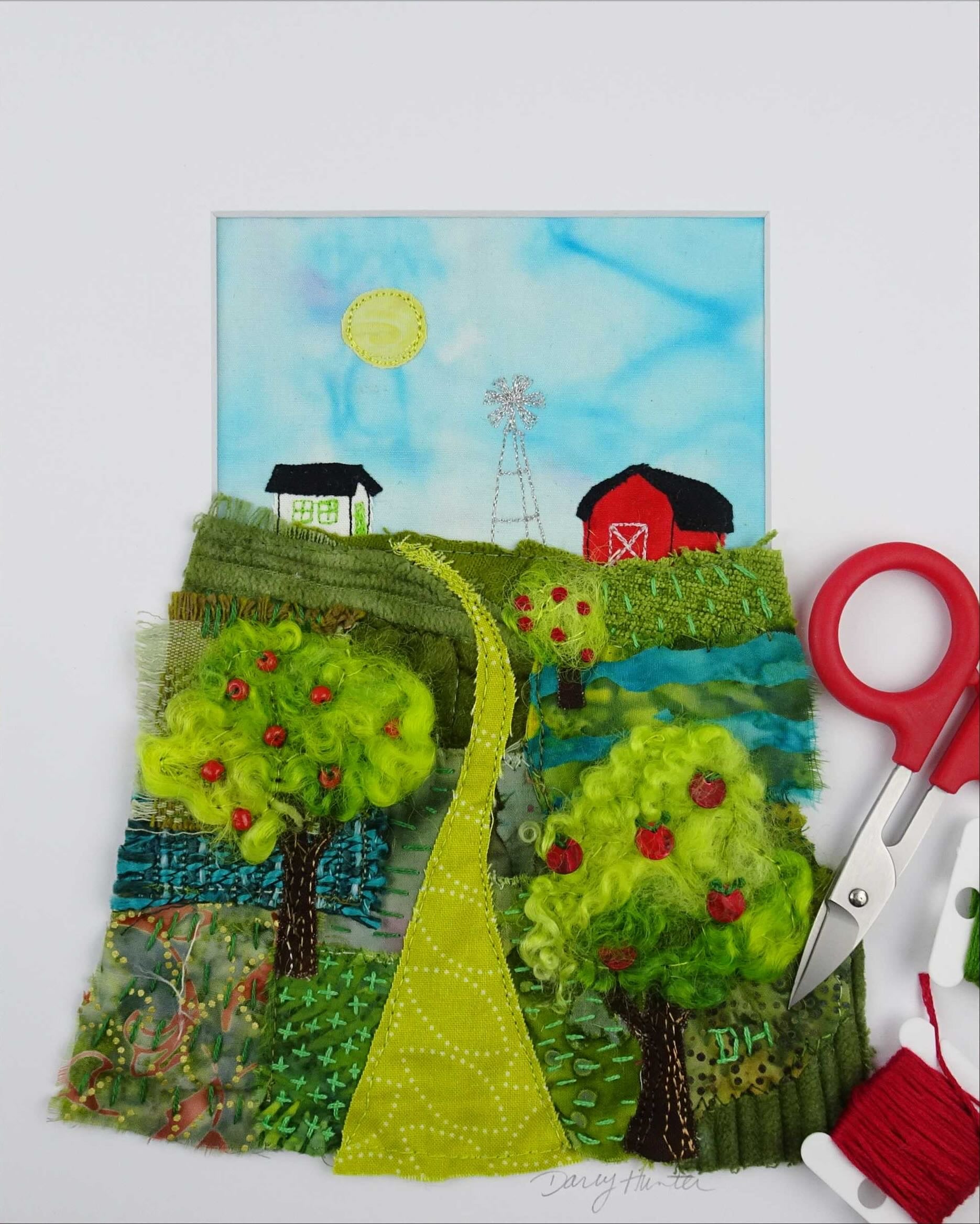 This hand-embroidered mixed media artwork was inspired by a neighbour’s farm and apple orchard. She first collaged a collection of textiles and machine stitched them onto a background. Details were added through hand-embroidery and beading. It is matted and framed in an 11 by 14-inch brown wood shadowbox frame. Techniques: Fabric collage, raw-edge applique, hand embroidery, hand dying fabrics, free motion
