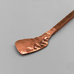 Hand-hammered copper cheese knife. Measuring about 5" to 6". Wrought from salvaged solid copper bar, it is hammered out and annealed, creating a one of a kind instrument. This piece is individually packed in its own flocked vinyl case.