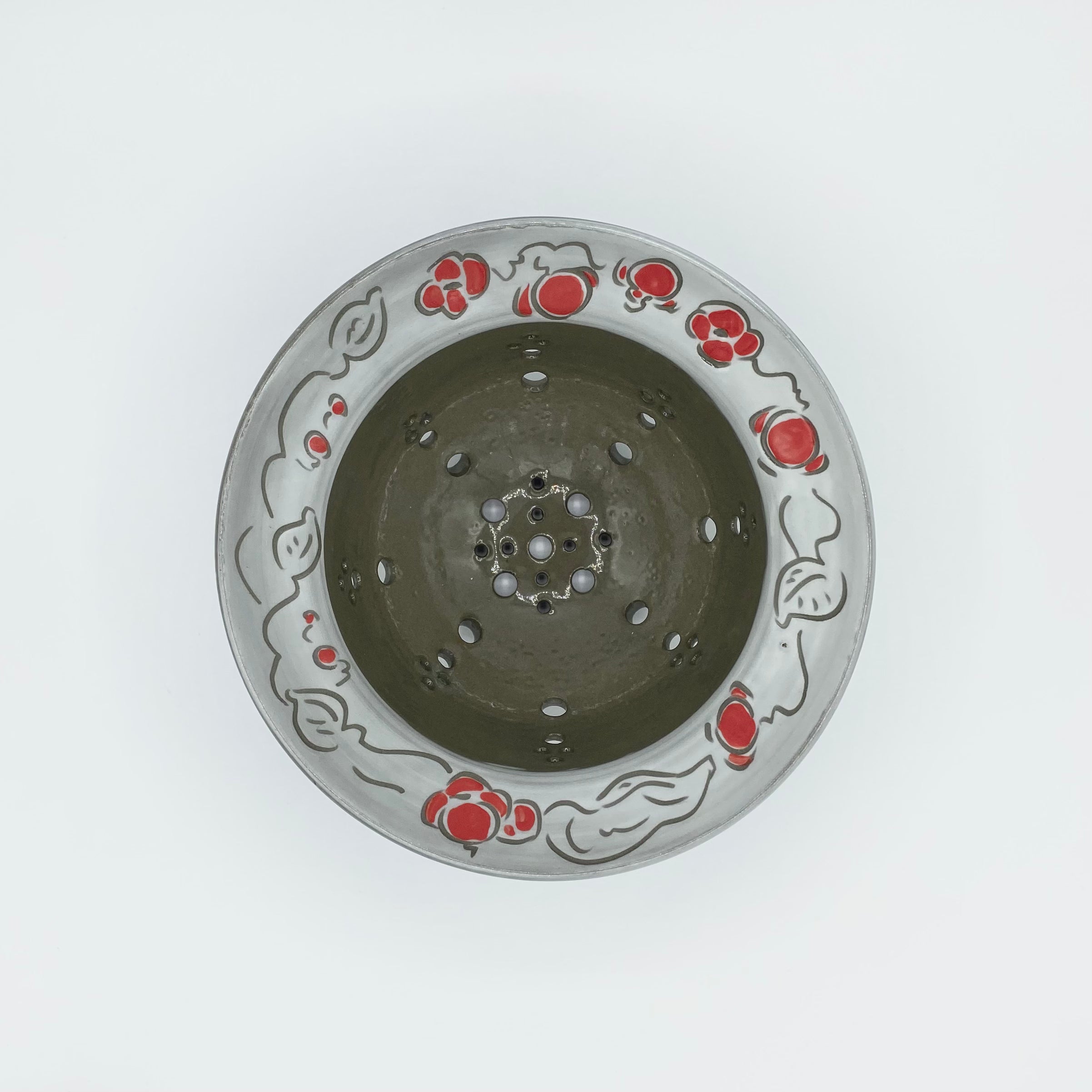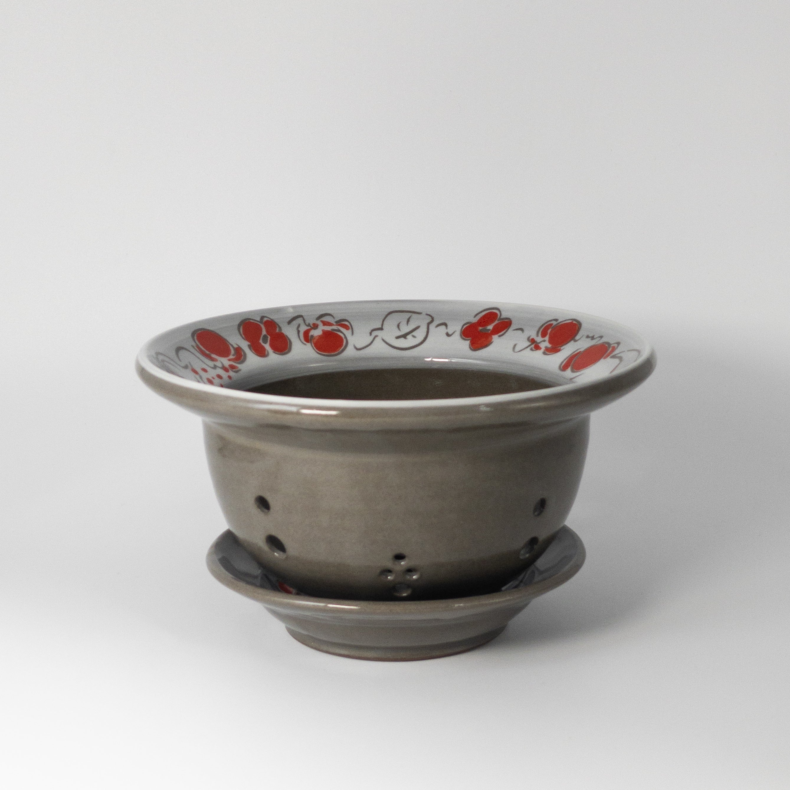 - Grey clay with porcelain slip, red under-glaze, and a transparent glaze.
