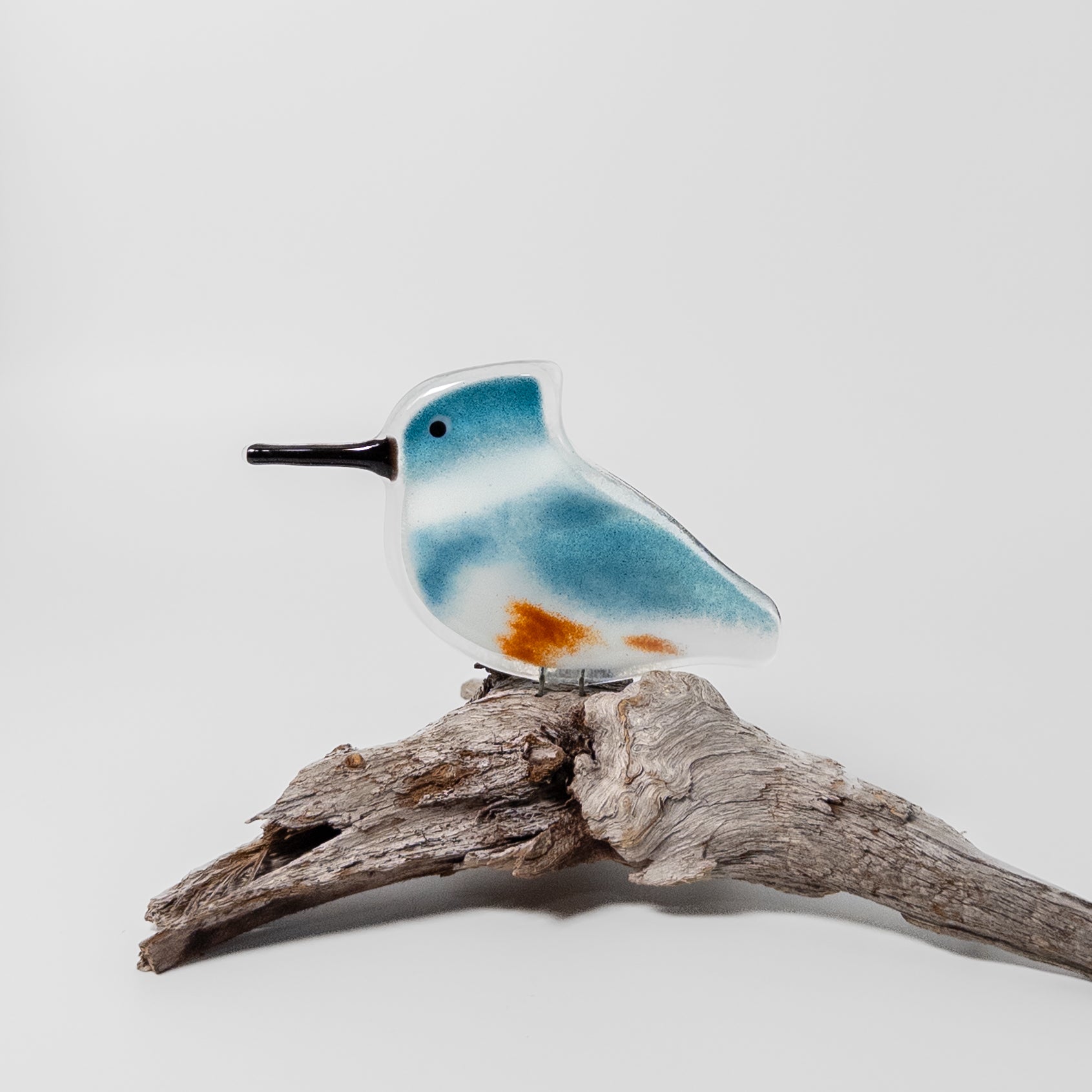 Your Kingfisher is crafted entirely from glass - no paints, glazes or moulds. The shape was designed and hand-cut with layers of coloured crushed glass built up on the clear shape before firing in a kiln over many hours. The bird comes with his own detachable driftwood perch that has been sanded on the underside for stability. Simply slot the birds legs into the holes in the top side of the wood.