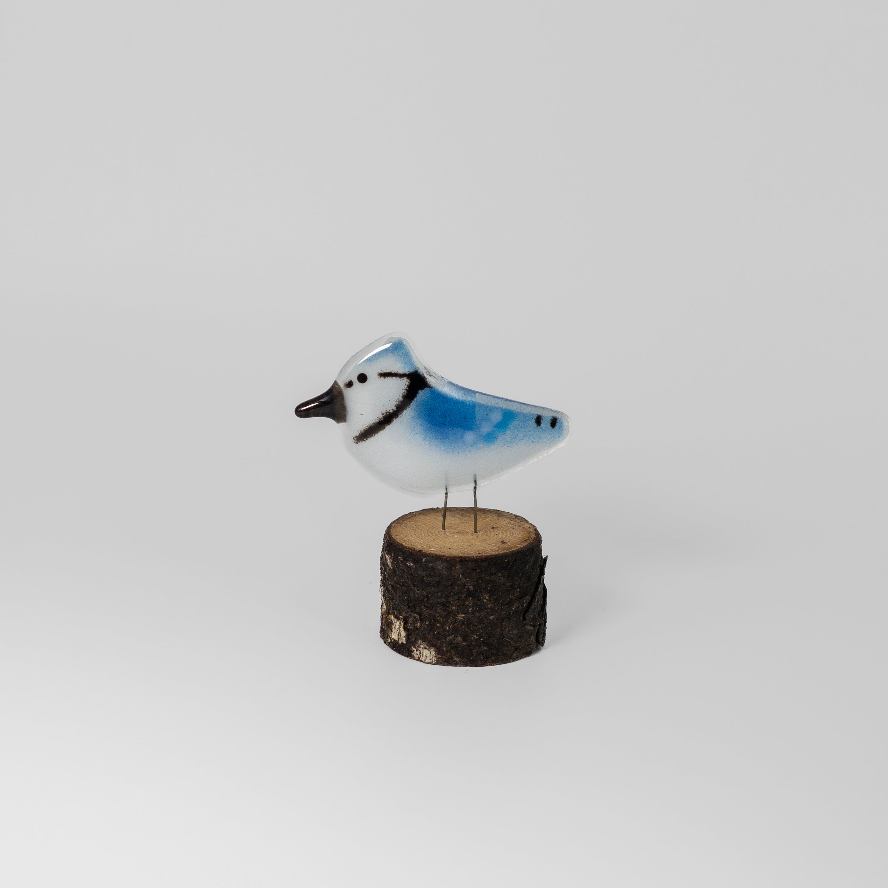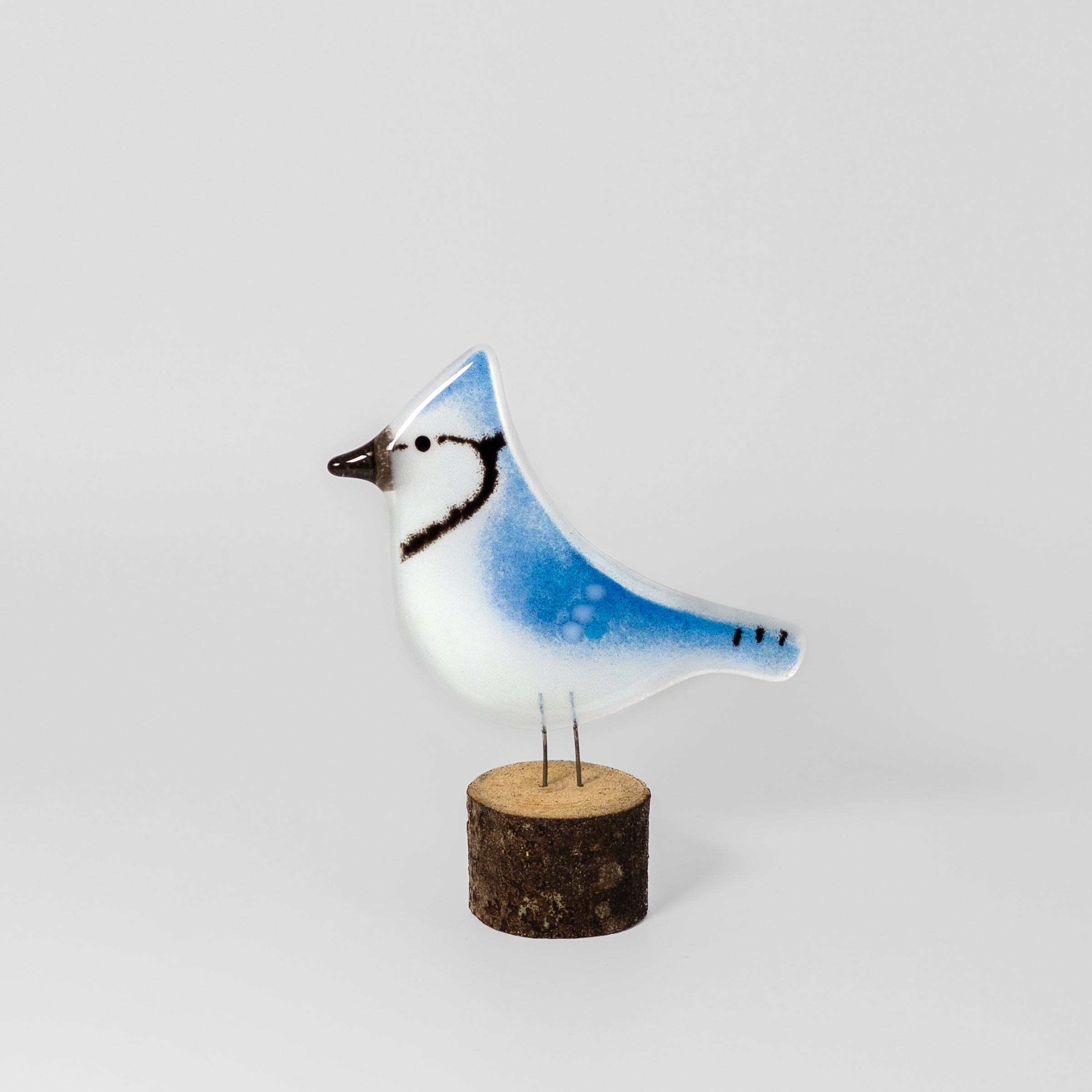 Your Blue Jay is crafted entirely from glass - no paints, glazes or moulds. The shape was designed and hand-cut with layers of coloured crushed glass built up on the clear shape before firing in a kiln over many hours. The bird comes with his own detachable driftwood perch that has been sanded on the underside for stability. Simply slot the birds legs into the holes in the top side of the wood.