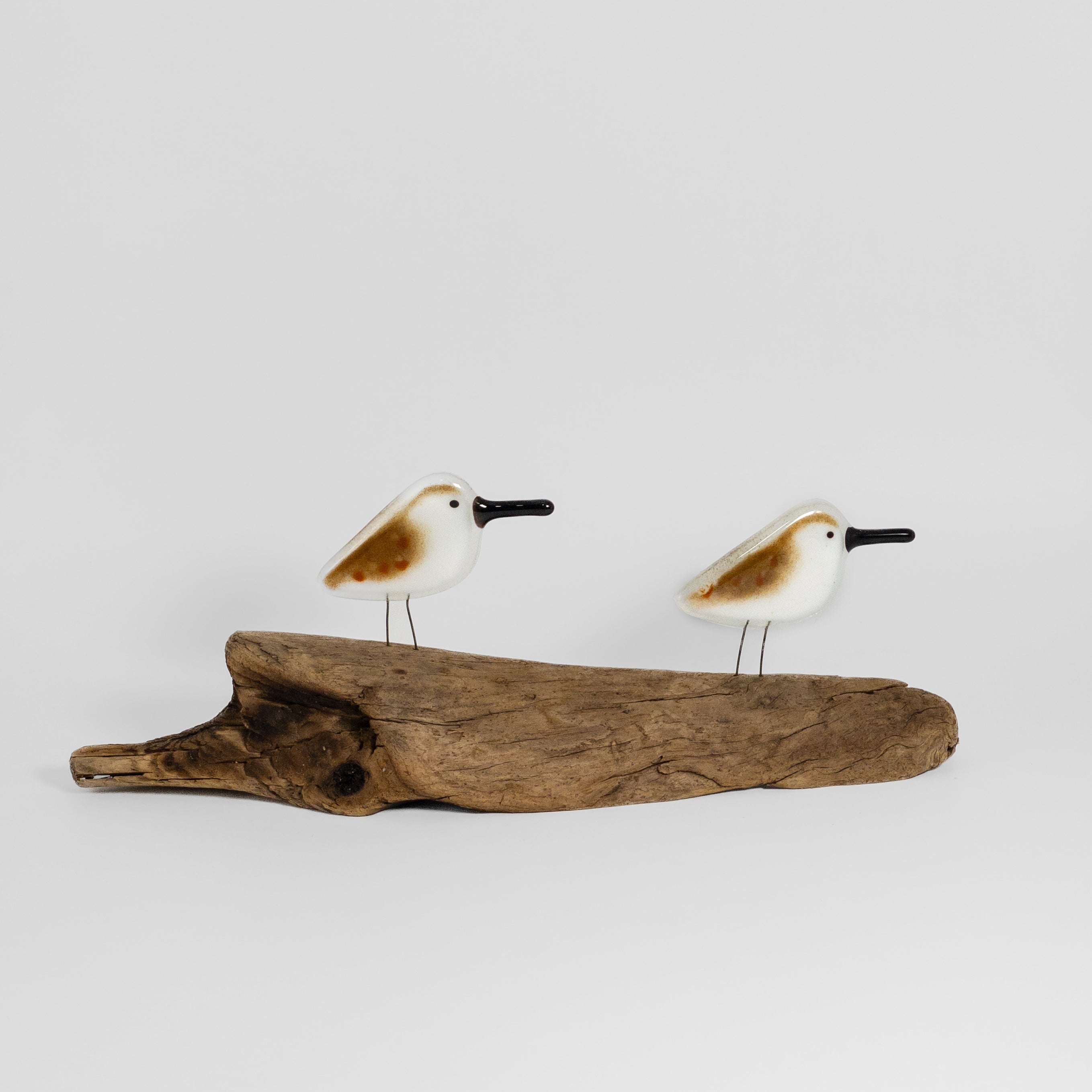 Your Sandpipers are crafted entirely from glass - no paints, glazes or moulds. The shape was designed and hand-cut with layers of coloured crushed glass built up on the clear shape before firing in a kiln over many hours. The bird comes with his own detachable driftwood perch that has been sanded on the underside for stability. Simply slot the birds legs into the holes in the top side of the wood.