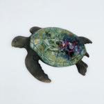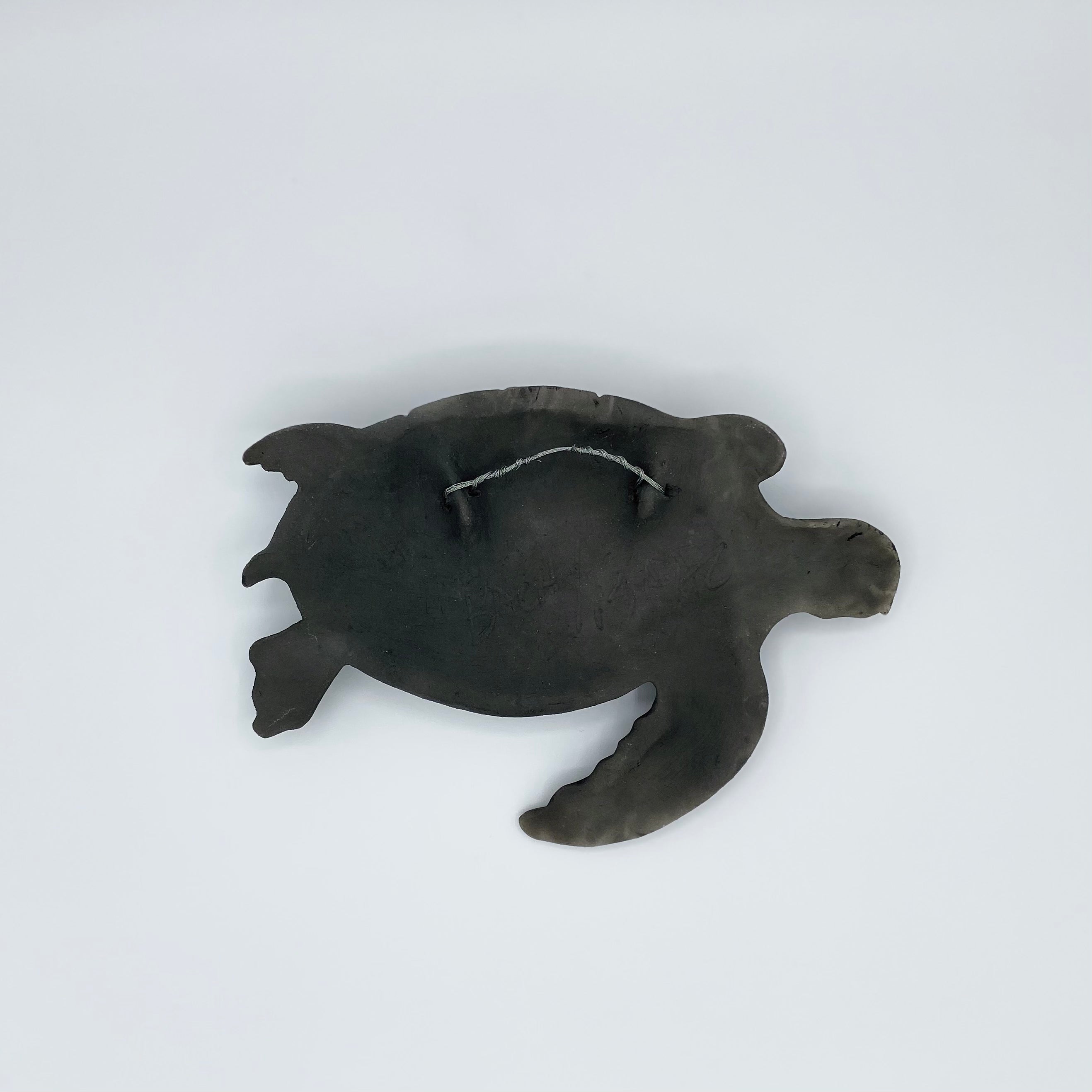 This hand crafted clay turtle by New Brunswick artists Karin Bach and Tim Isaac measures approximately 4 inches (10 cm) long and 3.5 inches (9 cm) high at the highest. It is about 3/4 inches (2 cm) thick with a small hook to hang on the wall.